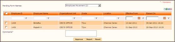 On selecting the form name, the list of employee movements that are waiting for approval will be shown as below: