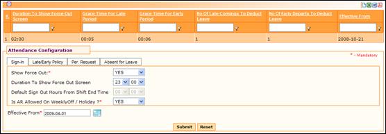 The Attendance sign-in and sign-out is based on the Attendance Configuration. The Attendance Configuration is common to all employees of the organization.