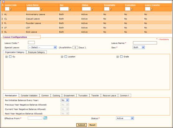 This form facilitates the configuration of leave types in an organization. There can be more than one Leave Type for the selected configuration period.